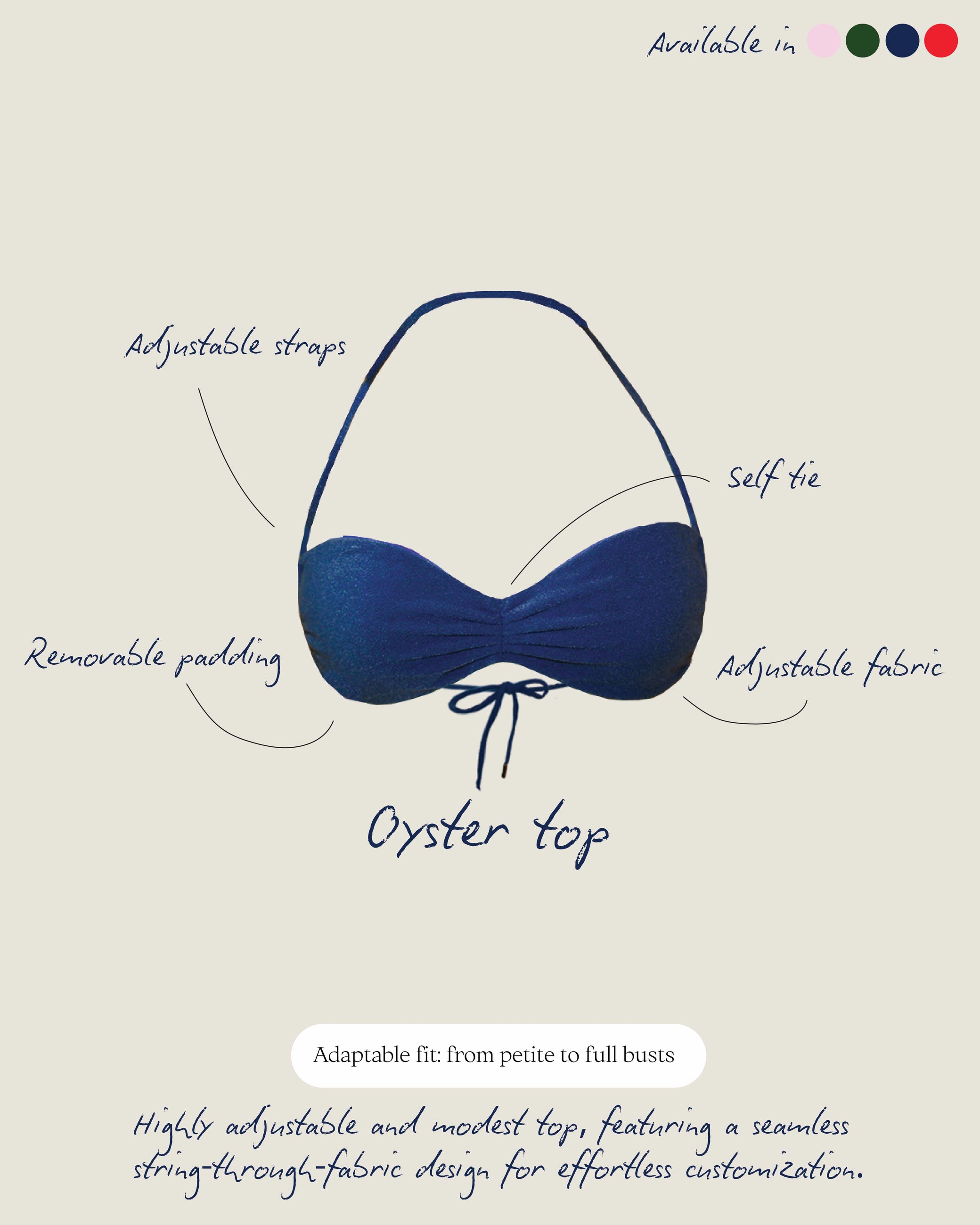 A ruched tube-style top with self-adjusting features and thick, removable paddings. You can adjust how high the top sits and how tight you want it to be. The oyster top is suitable for all cup sizes from AA. It offers greater coverage of the bust without drowning its charm due.