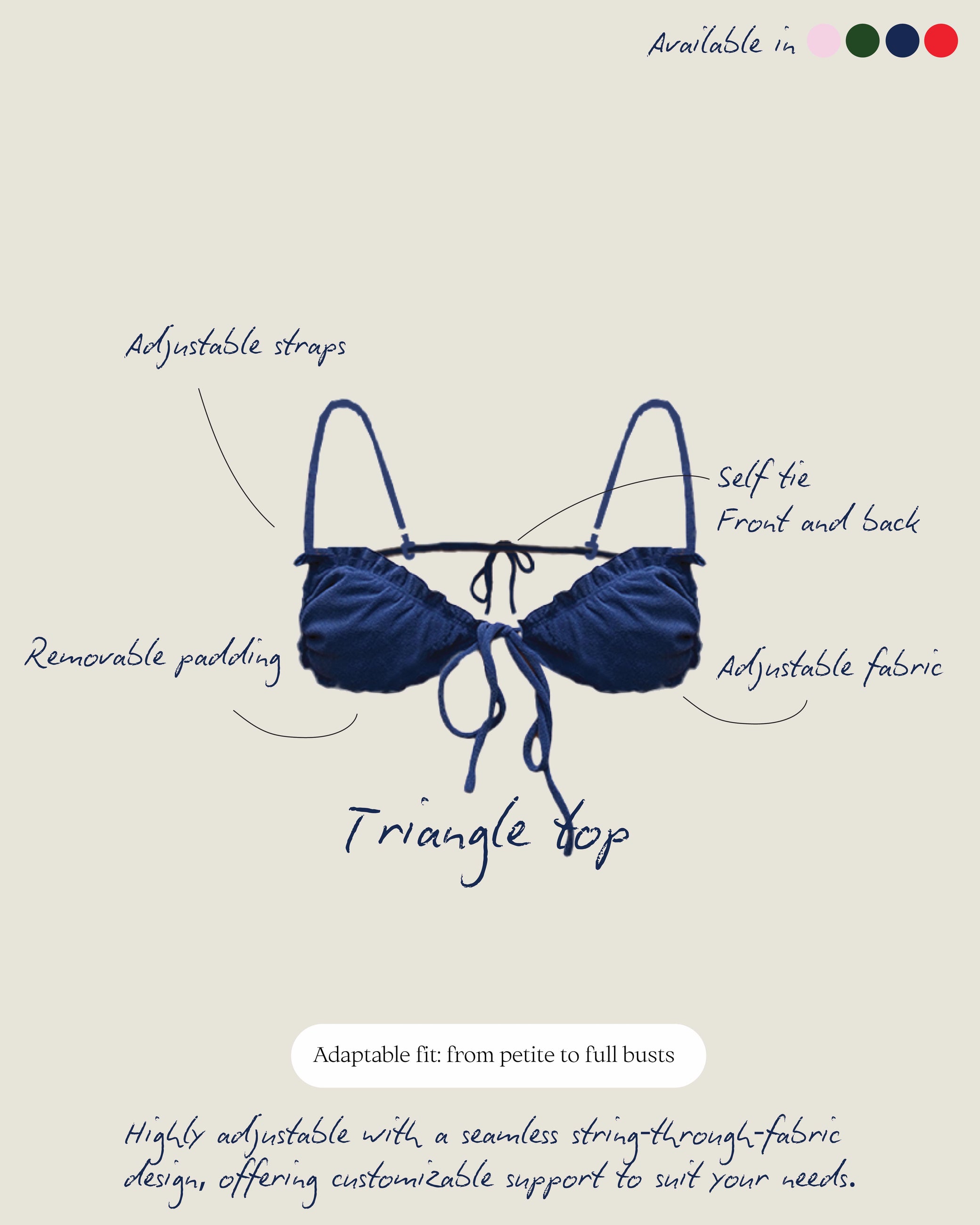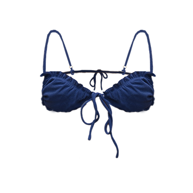 A cute, ruffly, adjustable self-tie triangle top that can be adjusted to provide as much support to any bust size. It comes with thick, removable paddings.