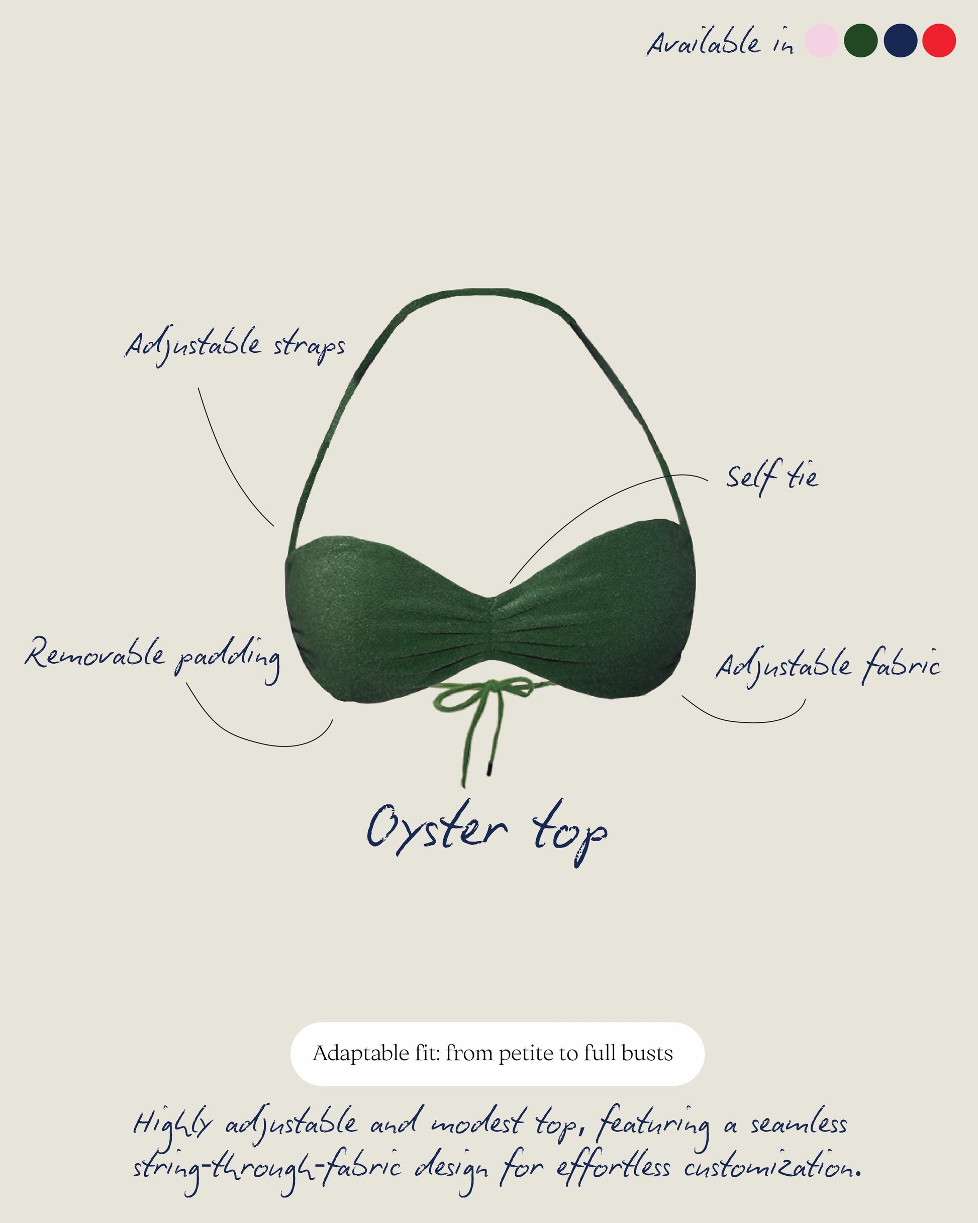 A ruched tube-style top with self-adjusting features and thick, removable paddings. You can adjust how high the top sits and how tight you want it to be. The oyster top is suitable for all cup sizes from AA. It offers greater coverage of the bust without drowning its charm due.