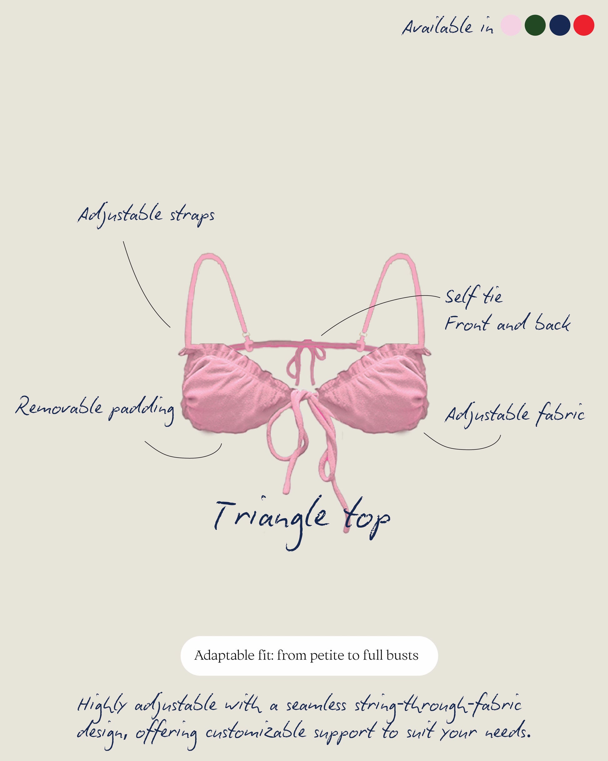 A cute, ruffly, adjustable self-tie triangle top that can be adjusted to provide as much support to any bust size. It comes with thick, removable paddings.