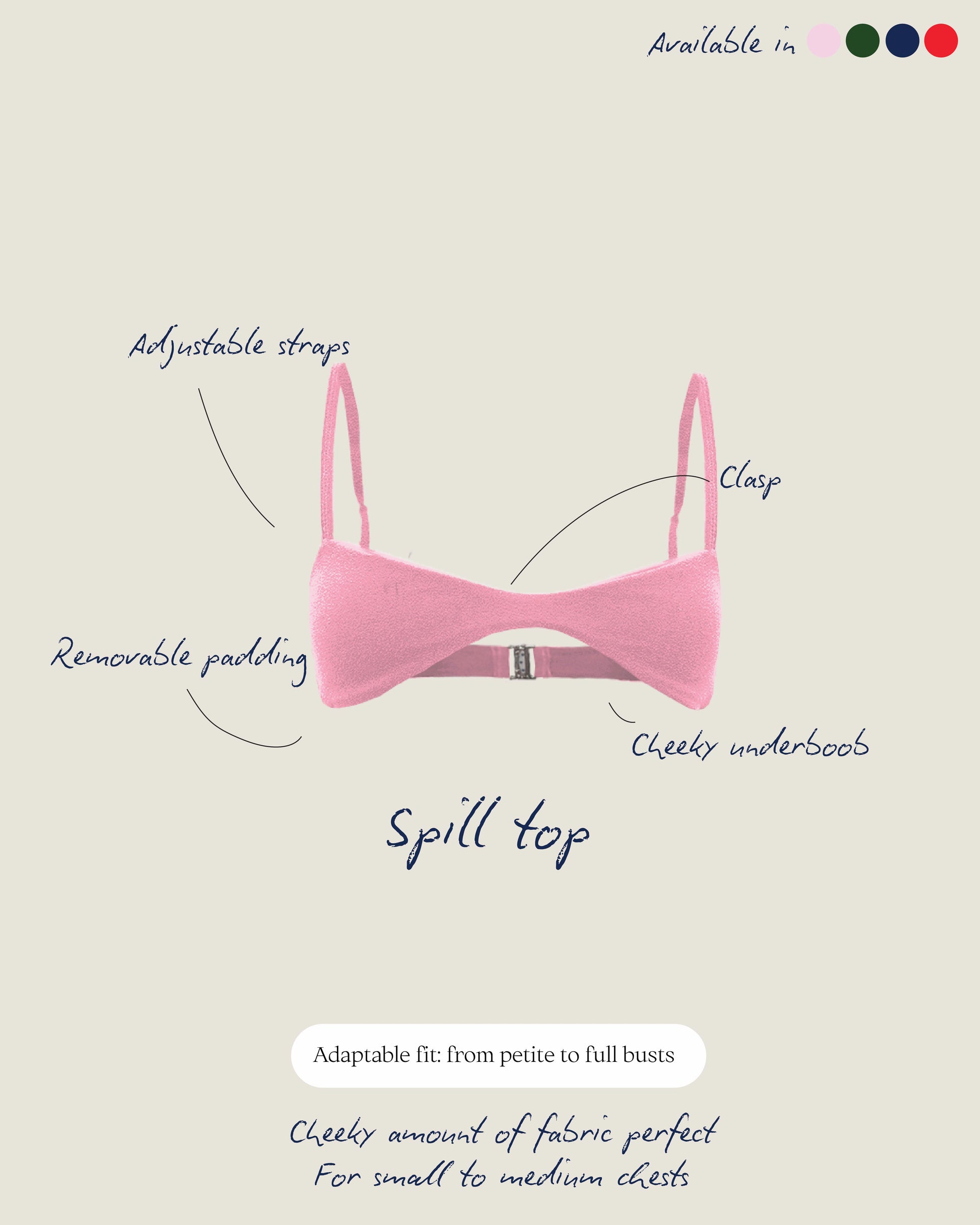 A cheeky top with lesser coverage designed to enhance the fullness of both flatter and fuller busts. The spill top is especially known for making flatter chests look fuller. It comes with a sophisticated back clasp and adjustable straps, as well as thick, removable paddings.