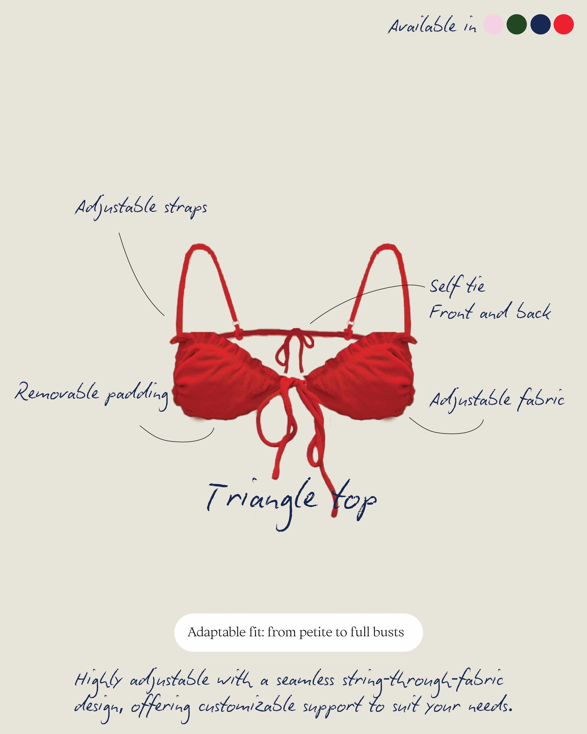 A cute, ruffly, adjustable self-tie triangle top that can be adjusted to provide as much support to any bust size. It comes with thick, removable paddings.
